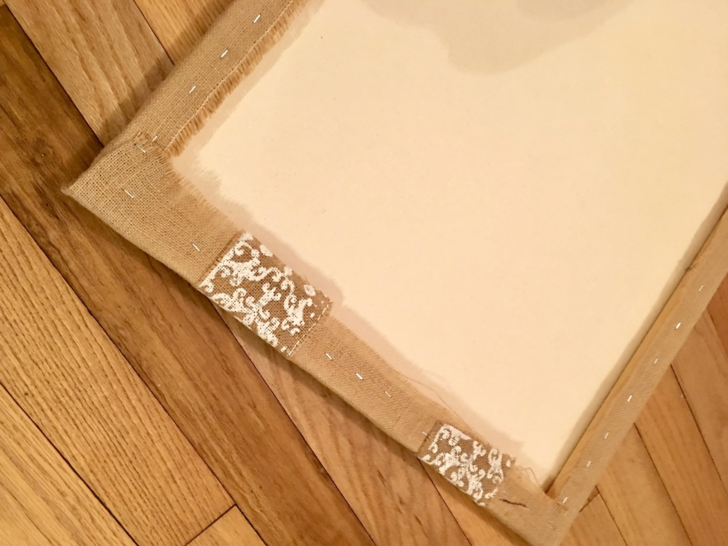 Step 4: Wrap the ribbon around the board and also staple it to the wooden frame. The number of strips of ribbon depend on how big your board is and how thick your ribbon is.